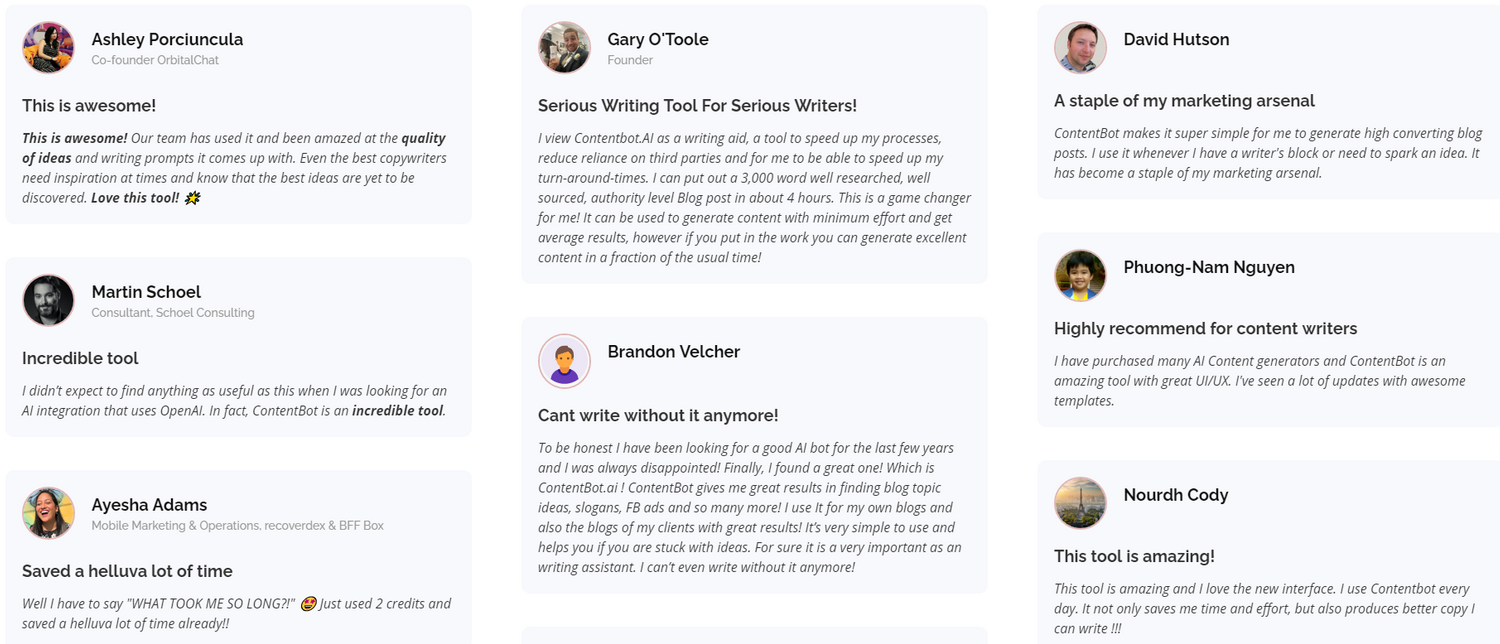 Content Bot is a great solution for: Bloggers, marketers, and copywriters who want to speed up content creation by leveraging the power of an AI assistant. They have a large team behind the product so I am optimistic they will keep innovating and release more features that set them apart from the alternatives for generating AI blog posts. You won't get really high quality content from a 1 click blog post, but it still has plenty of uses. It could be used for generating traffic by creating or rewriting answers for Quora, etc. For money site articles, I will continue using Jasper AI's long form writing assistant.